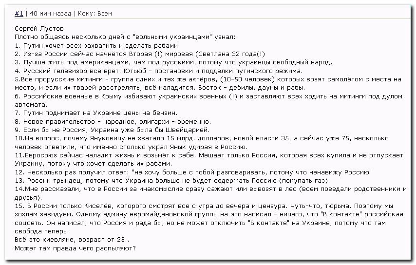 Не нужно там ниче придумывать-сами управятся-процесс стал уже НЕОБРАТИМЫМ.Поддержать,дать чутка денег-дать понять,что Россия с ними-будет достаточно.Местные власти практически везде с народом-менты против своих не пойдут,а чужих туда не пустят.Народ на столько в этом уверен,что в Енакиево даже барикад не строили.Да и "захваты" там были чисто номинальные-чисто обозначиться-ментуру,та что на Свердлова(горотдел) например и не штурмовали-закидали дымовыми шашками и спиZдили сервак-менты даже и не дернулись-кто разбежался,а кто просто сидел ровно,А как иначе-город небольшой-все друг друга знают-где им потом скрываться?В Осетии и Абхазии практически всё население было с российскими паспортами и базовая формулировка была "для защиты российских граждан от агрессии", а тут... - надо чё то новое придумывать....